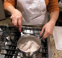 Cut the pork, veal, and chicken in small dice. Boil all the meats together in a small saucepan until tender. Transfer the meat to a food processor. Pulse a few times to reduce to a coarse compound.