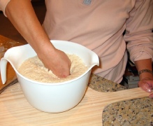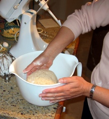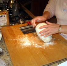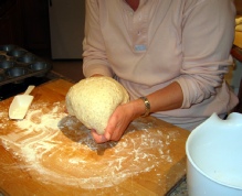 Transfer the dough to a lightly floured work surface. Knead the dough for about 5 minutes. Shape dough into a round form, tucking the sides under the ball and stretching the surface to make it smooth.