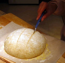 Preheat oven to 425 F (220 C). When the dough is well risen, remove the cover. Optionally, using a very sharp knife or a box cutter, slit across the top of the loaf several times. Transfer the loaf to the oven, sliding it very carefully without touching or pushing it. Bake for about 1 hour or until it is deep brown in color. When the bread is ready, the surface will crackle, and it will make a hollow sound when tapped. Cool it on a rack at room temperature.
