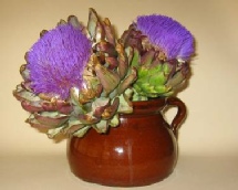 Artichokes (Cynara Scolymus) are originally from the Mediterranean area, and the wild ones were already known to the ancient Romans (i.e. Carduos, their word for thistle). They are the flower bud of a thistle-like plant. The edible part is the bud bottom. The artichoke is nipped in the bud before it can flower so it can be utilized as food, but the flower, if the plant is allowed to flower, is a large blossom about 6 - 7 inch (15 – 18 cm) wide of a deep blue-violet color.