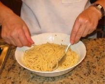 When pasta is al dente (firm but not too soft or overcooked), drain and transfer to a bowl.