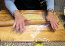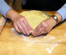 Using a rolling pin flatten the dough to a disk, approximately the size of the pan.