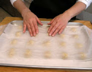 Line a cookie sheet or flat oven pan with parchment paper. Form small balls the size of walnuts. Place them on the pan approximately 2” (5 cm) apart.