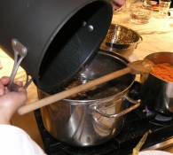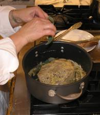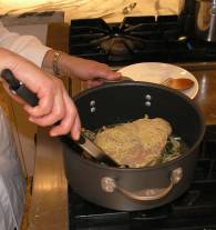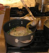 Turn heat to medium. If the liquid in the pan appears scarce, add some of the broth. Using a wooden spoon, scrape the residue of the gravy from the bottom of the pan.