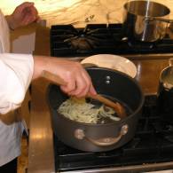 Put olive oil, butter, and onion in a large saucepan. Turn heat to medium and sauté until the onion is soft and translucent.