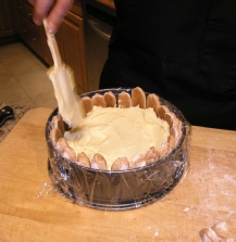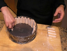 Trim the ladyfinger cookies to the length necessary to just  cover the sides of the pan. Place the cookies all around the walls of the pan.