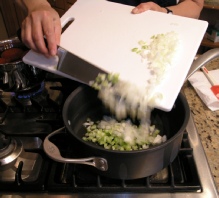 Finely chop together the onion, celery, carrots, and garlic. Put the olive oil in a saucepan and turn heat to medium. Add the chopped vegetable and sauté until the onion is soft and translucent.
