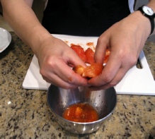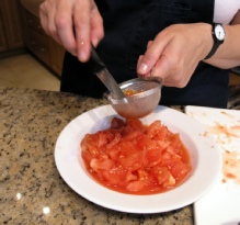 Peel the tomatoes and remove seed. Place the tomatoes in a bowl.