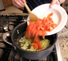 Add the tomatoes to the pan. Add salt and pepper. Cook for about 20 minutes.