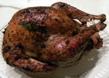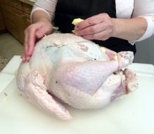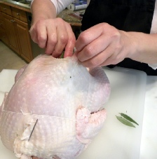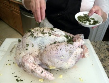 Season with salt and pepper. In a dish combine the chopped sage and the chopped rosemary. Spread the rosemary/sage mix on the bird.