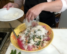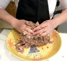 Place in a large bowl the ground meat, onion, garlic, egg, parsley, parmigiano, breadcrumbs, raisin, pine seed, orange rind, chopped chestnuts, salt and pepper.