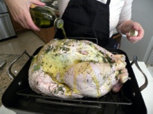 Transfer the turkey to a roasting pan. Spread the surface with the olive oil.